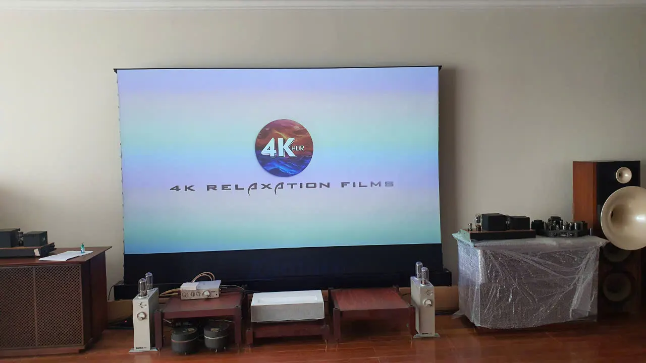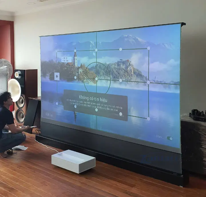 Bàn giao bộ Máy chiếu siêu gần 4K LG HU715QW và Màn chiếu quang học để sàn VIVIDSTORM 120 in