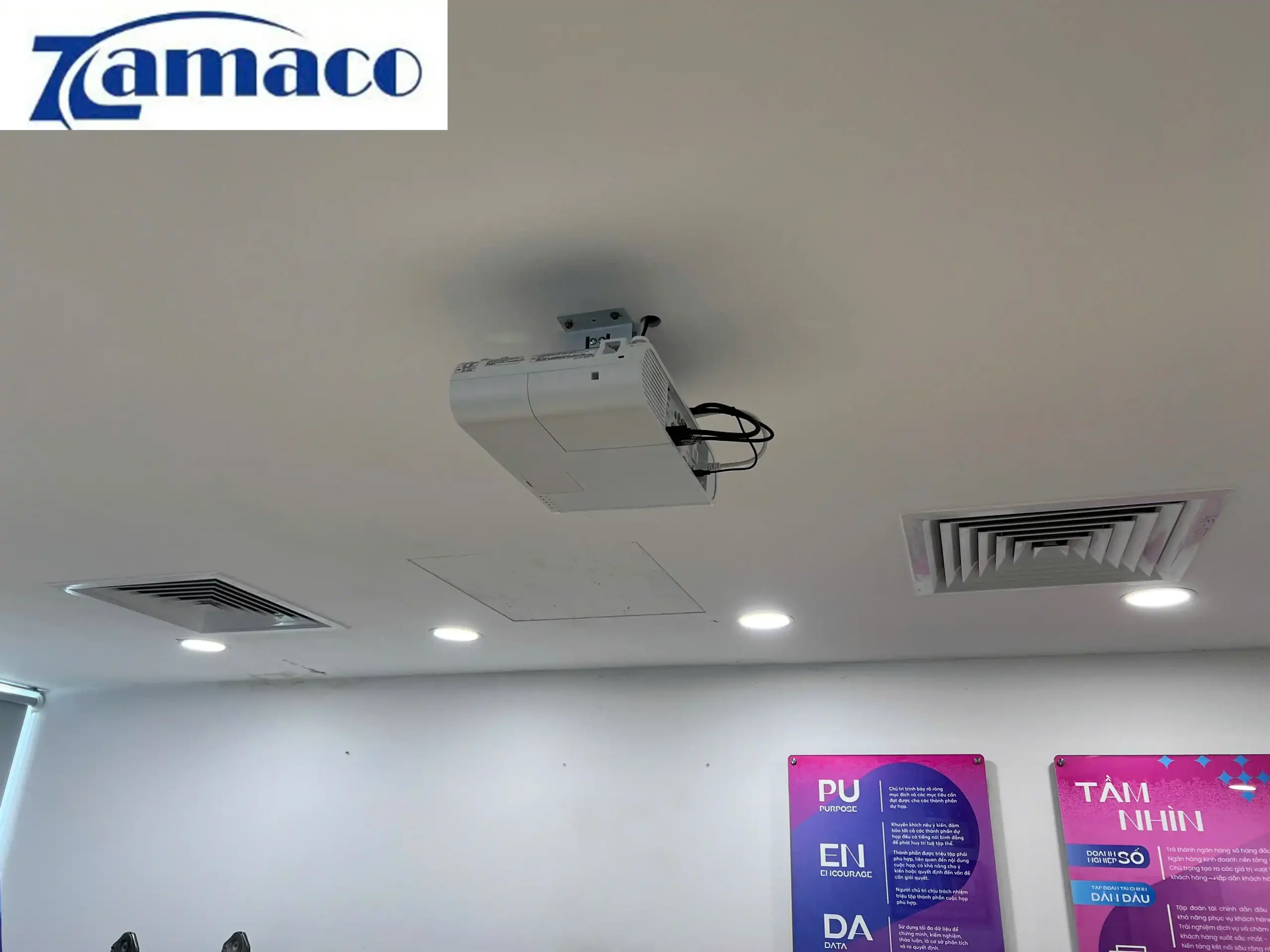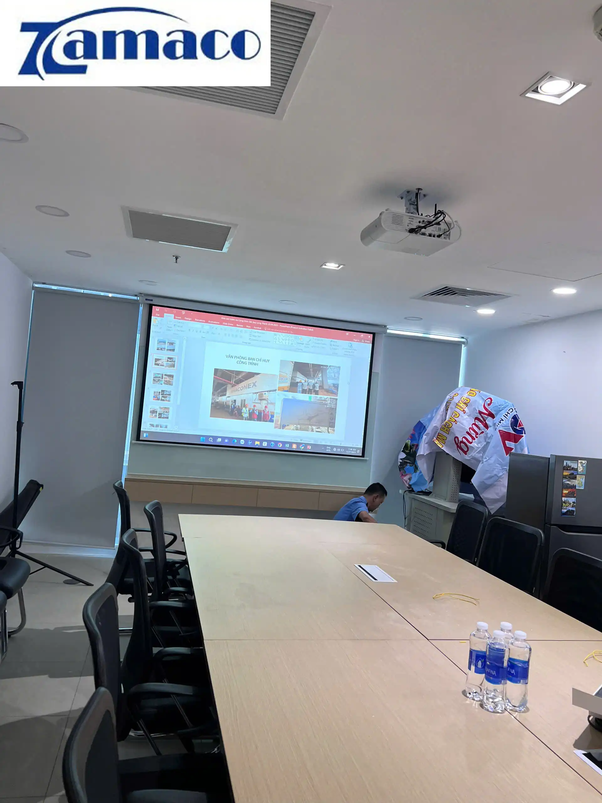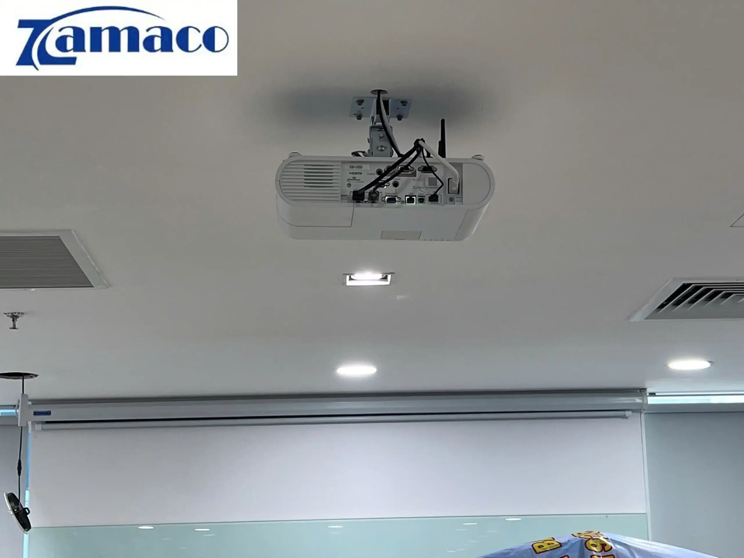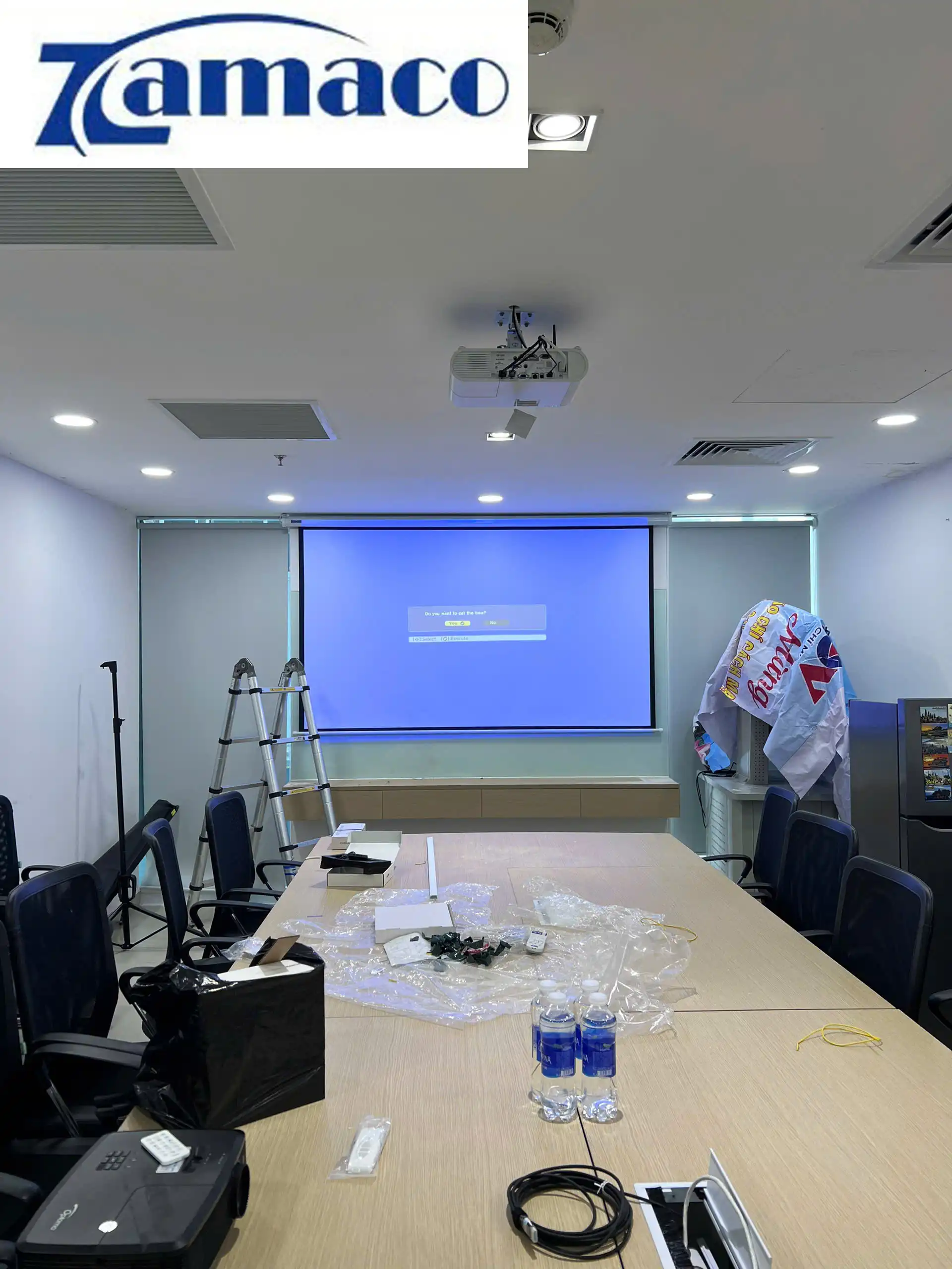 Lắp đặt máy chiếu cũ Epson EB-U50 và màn chiếu điện 100in 16:9: một combo máy chiếu Full HD cho phòng họp chi nhánh ngân hàng MB Bank Quận 1 đã được ZAMACO tư vấn và triển khai. Các thiết bị gồm có: