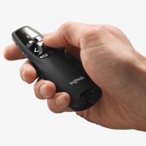 Ngoài ra, trên bút Logitech R400 còn tích hợp đèn laser để bạn có thể chỉ dẫn chính xác vào nội dung mà mình muốn trình bày trên màn hình, giúp người xem có thể tập trung một cách tối đa để theo kịp buổi thuyết trình của bạn.