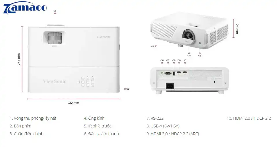 – Cổng kết nối: HDMIx2, Audio, Bluetooth, RS232, USB-A…