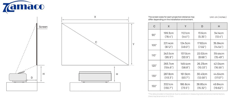 - Công nghệ chiếu cực ngắn: Chiếu hình ảnh trên màn hình lớn 100 inch chỉ cách tường 17,8 cm, nhờ tỷ lệ chiếu tiên tiến 0,177:1, hoàn hảo cho mọi kích thước phòng.